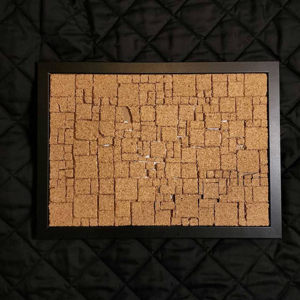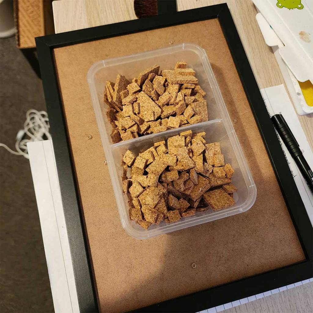 Cut the cork sheet into a mix of 1x1cm, 2x2cm and 3x3cm squares. You can also cut some 1x2cm, 2x3cm rectangles for more variation.