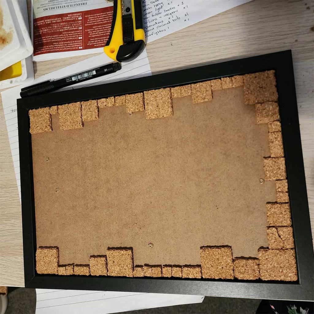 Once you’re happy with the edge layout, you can start glueing them down onto the frame backing board. you can leave it in the frame for now to get a nice fit between the frame and the bricks.
