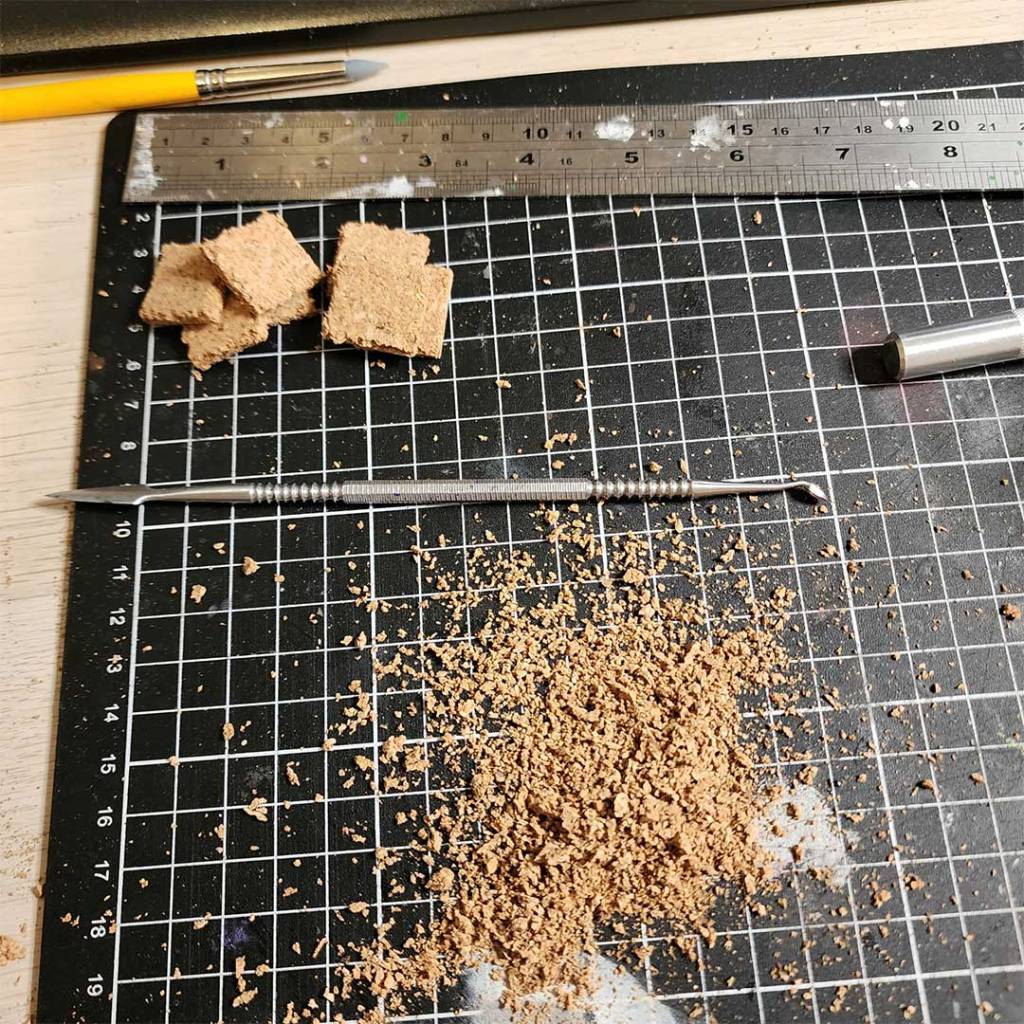 Bevel the edge of the cork bricks. This can be done by running the back of a craft knife along the edge of the bricks to roughen them up. I found using the textured? Part of my sculpting tool worked quite well.