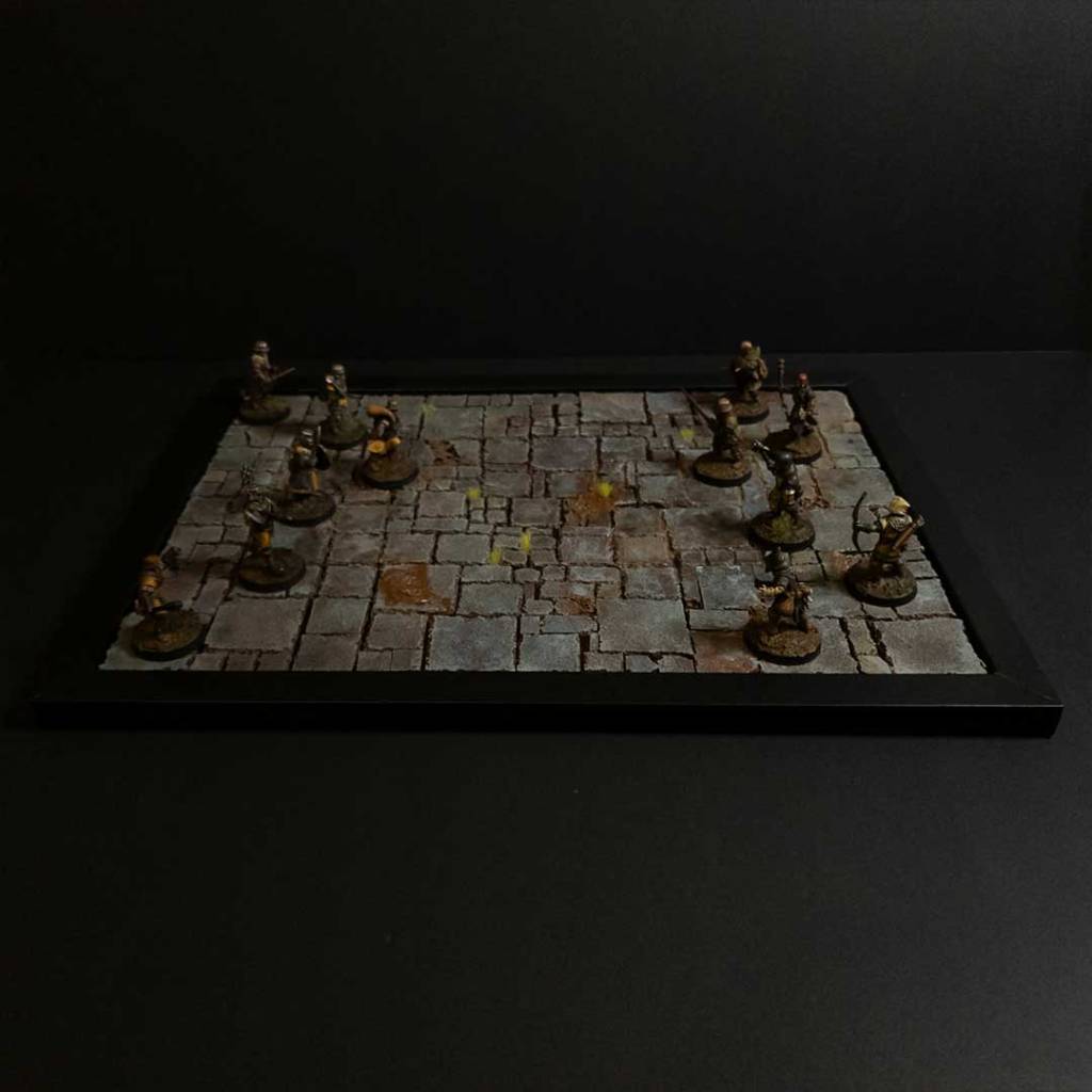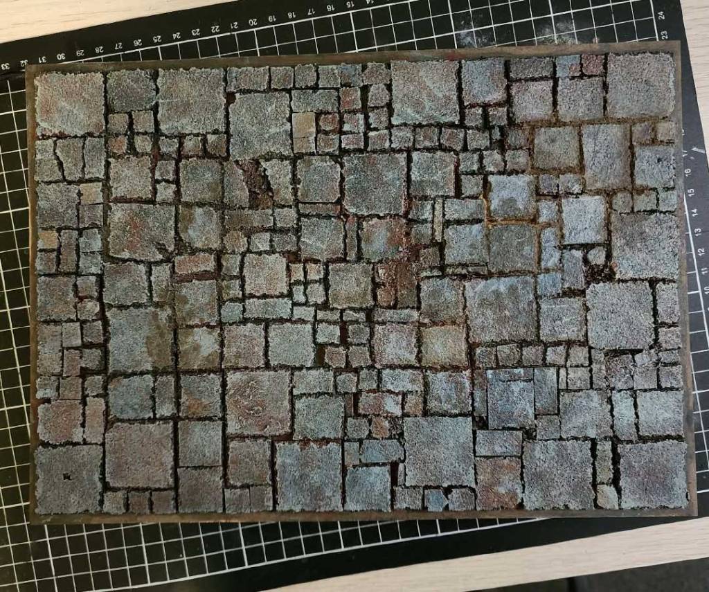 Adding the final details. i added some grass tuffs into some of the larger gaps. you could add more texture paste or grout to fill the gaps. i had done an experiement with part of the board and didnt really like the results myself.